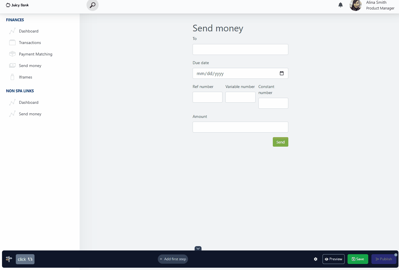 Tours can navigate smoothly between URLs and pages in your platform. Use the "Target Click" advance action here to allow the user to navigate your platform while being guided by the tour. This method is effective for showing users how to get to places in your application by themselves, as they will be executing the actual clicks to get there.